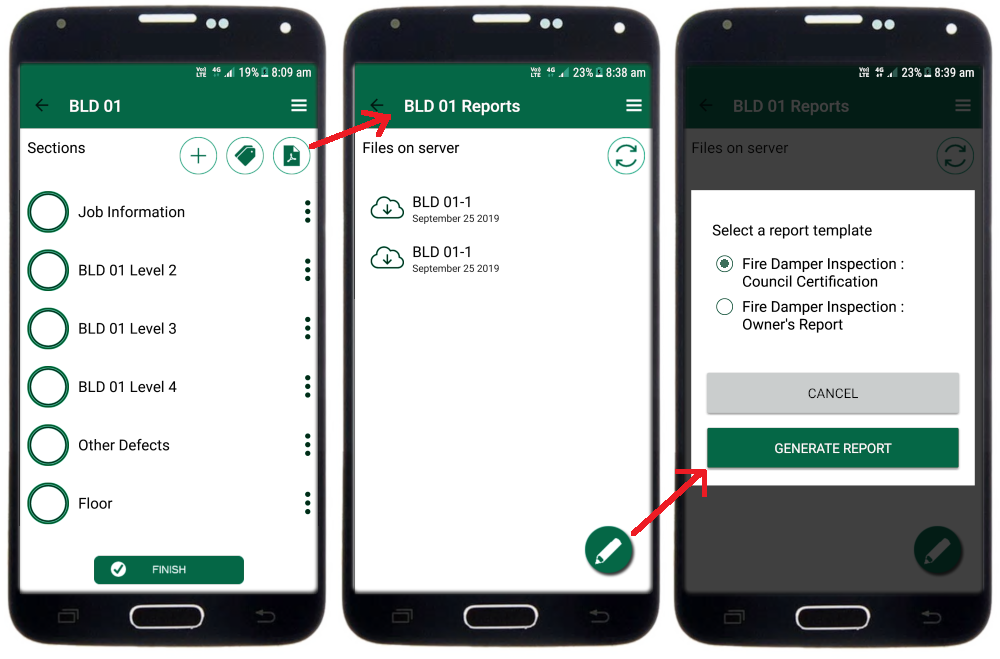 To generate a report, go back to the start of the document and tap the PDF icon in the top right-hand corner. This will take you to the reports page, where you’ll see any existing reports. To generate a new one, tap the pencil icon in the bottom right-hand corner. Select from the list of available report designs and then tap the Generate Report button.